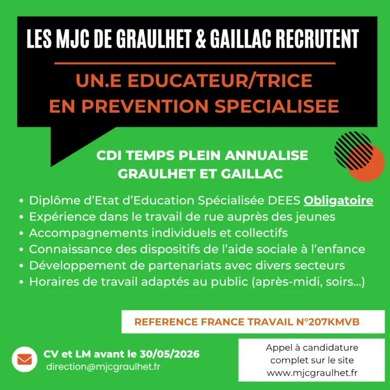 La MJC de Graulhet en consortium avec la MJC de Gaillac recherche un.e éducateur-trice en prévention spécialisée à temps plein réparti entre les villes de Graulhet et Gaillac: