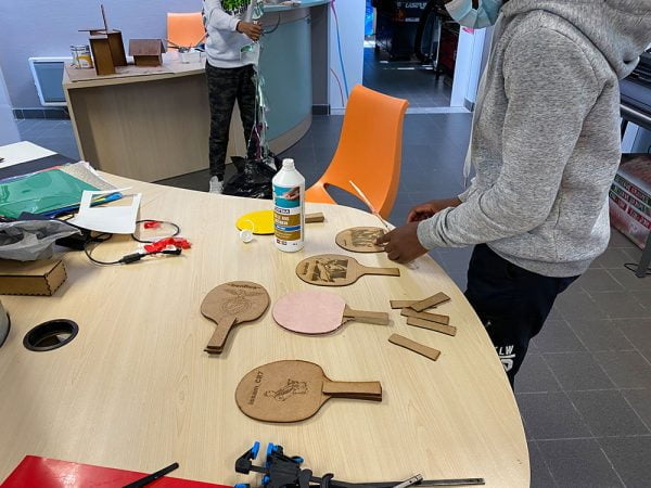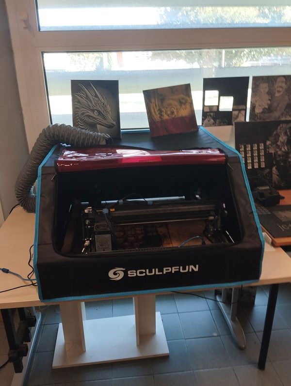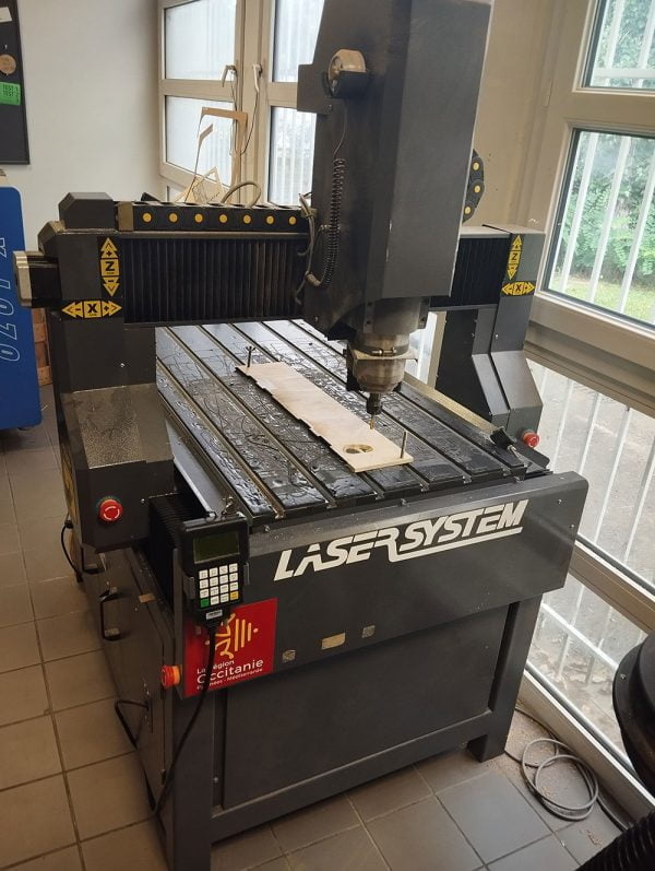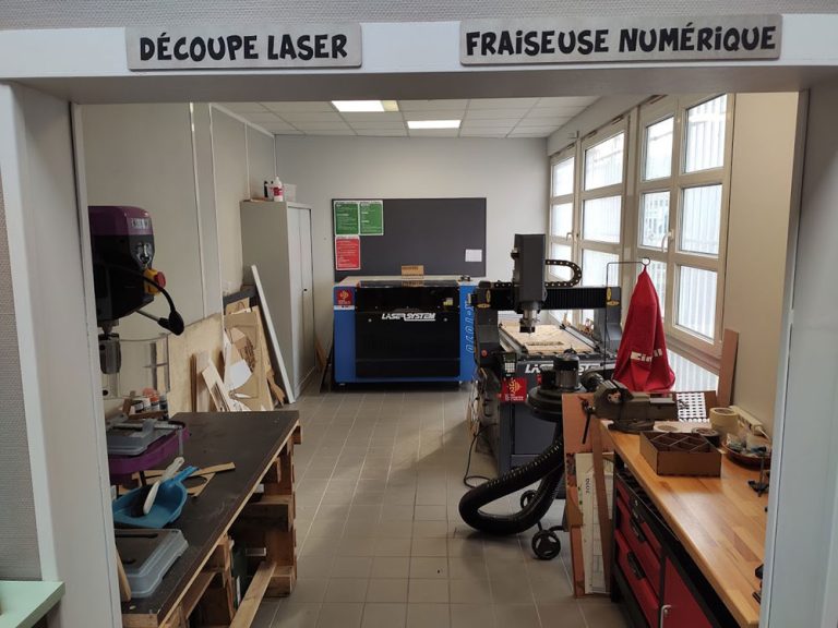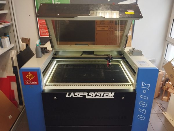 Nous avons 2 découpe laser : une grosse (1 mètre de largeur) fixe et une petite itinérante.